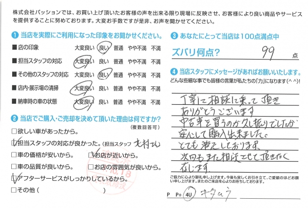 初めて行った時に今田さん山口さん達の対応がとても良く一人で行って少し不安だったのですが・・・・とっても安心して車を買う事が出来ました。ありがとうございました。